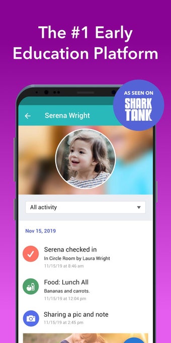 - Elever: Spåra närvaro och rumskvoter, dela foton och videor, bedöma inlärningsmilstolpar, kommunicera med föräldrar, skicka papperslösa fakturor och betalningar, granska dagliga blad och hantera personal.